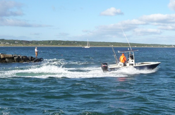 On the last Sunday in September, Lev drove down to the dock in Menemsha, the salty waterman’s village where his boat Wampum — eighteen feet, nine inches of gore-splattered fiberglass — bobbed among the scrum of gritty workboats, hulking commercial trawlers and burnished pleasure crafts. Wearing a hooded sweatshirt again the brisk evening air, he eased the boat past the Texaco station and Squid Row, a weathered bench where islanders and tourists keep watch over the action in the harbor. Once clear of the inlet’s twin jetties, he gunned the engine and headed for the spot where all of the biggest stripers had been caught so far in the derby. He had the place more or less to himself.