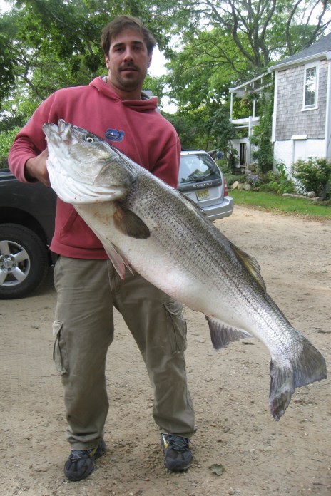 It was 8:45. The derby weigh station on the Edgartown waterfront closed at ten o’clock. He raced to the harbor, docked the boat, and deposited the fish into a cooler in the back of his truck. Then he flew across the island, laughing like a madman and passing cars on the two-lane roads. He walked into the claustrophobic old fisherman’s shack dragging his massive cooler, the striper’s tail jutting out the side. His hair was mussed, the left leg of his cargo pants soaked to the knee, his sun-bleached sweatshirt splotched with fish slime. He pulled out a fish with a head the size of a five-gallon bucket and the approximate build of a telephone pole. And there was this: Its belly was huge, distended and misshapen. He was almost trembling as the fish went on the scale and the digital display on the wall ticked up and down and leveled off.