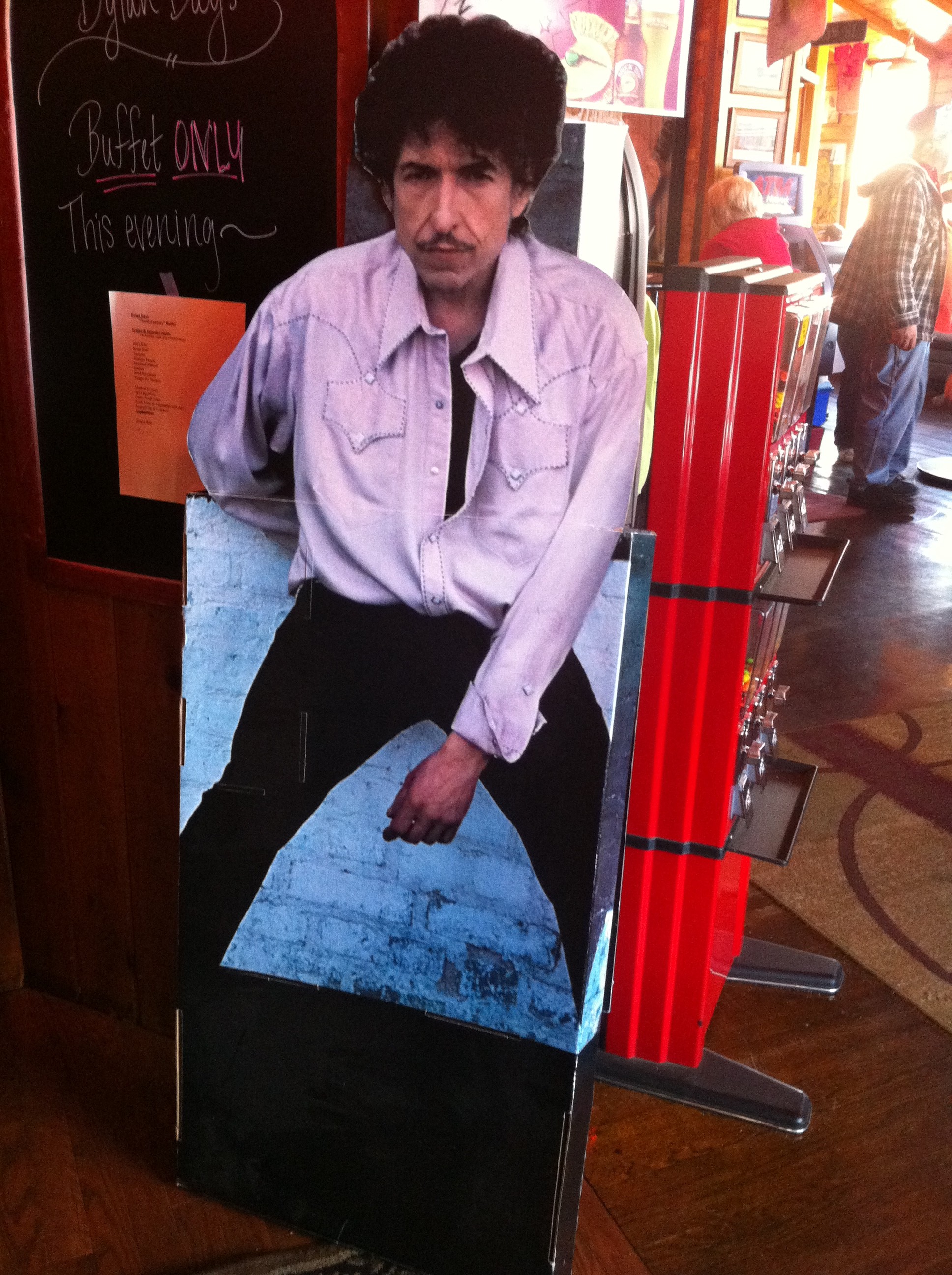 An exceedingly friendly woman named Linda Stroback ran the operation. Her husband, Bob Hocking, a social worker, was responsible for all the Dylan memorabilia. They’re Dylan fans who met in art school in Montana, and ended up back in Hibbing, where Hocking grew up. The restaurant had been in business before they arrived, but it was Linda who, after working there a while, suggested changing the name. She hoped the Dylan reference would be a hook to keep the place afloat by drawing visitors from outside Hibbing. She and Bob became majority owners of the restaurant in 2000.